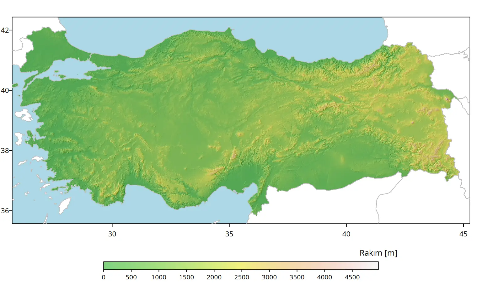 Verinin çıktısında birçok temel bilgiye erişebiliriz. Gördüğünüz gibi veri SpatRaster sınıfında; satır sayısı 792, sütun sayısı 2340 olan, toplamda 1853280 hücreden oluşuyor. Çözünürlüğü 0.008333333 derece, yani yaklaşık 1 km diyebiliriz. Verinin extent’i Türkiye sınırlarını kapsıyor. Minimum değer -42 m, iken maksimum değer 4972 m. Yaklaşık 1 km çözünürlüğe sahip olduğunu düşündüğümüzde neredeyse Ağrı Dağı’nın 5137 metrelik rakımını yakalıyormuş. Gayet iyi.