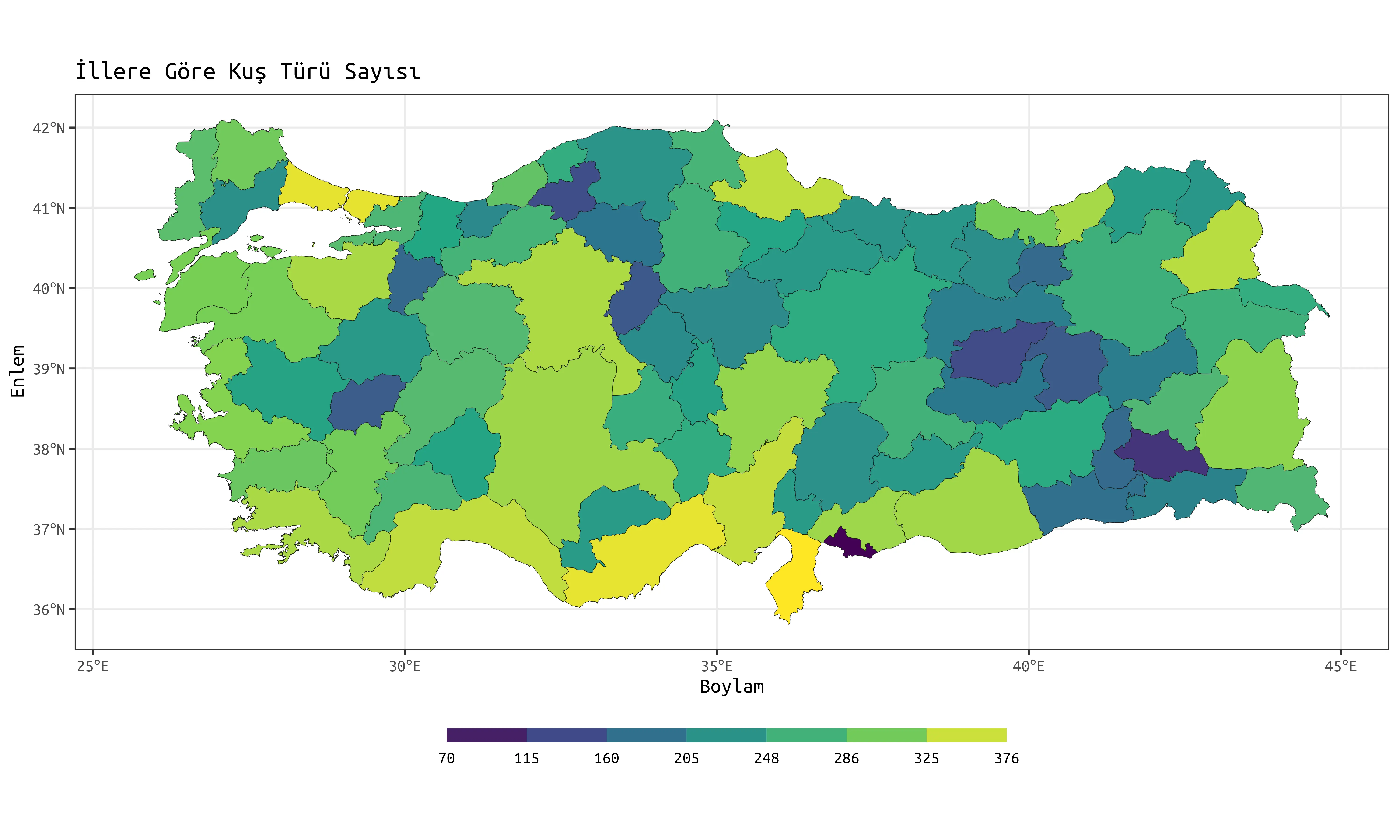 Gördüğünüz gibi çok daha iyi bir görselleştirme oldu. Şu an elimizde, Türkiye’deki illere göre kuş türü sayısını gösteren bir harita bulunmakta. Ancak bu harita üzerinden yapacağımız yorumlarda dikkatli olmamız gereken birkaç önemli nokta var. İl yüzölçümünün ve illere göre gözlem sayısının farklı olmasından kaynaklanan yanlılık (bias) potansiyeli. Bu harita genel fikirler verebilir ancak net çıkarımlar için verinin standartlaştırılması ve istatistiki testlere tabi tutulması önem arz etmektedir.